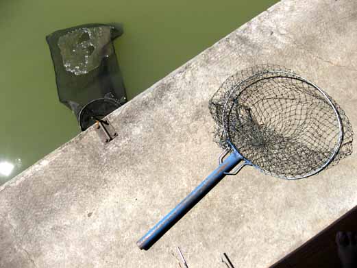 6. Perhatikan tali merentang panjang di atas kolam, sementara umpan yang tadi kita pasang sudah tenggelam di dalam kolam. Pelampung (yang ditunjukkan anak panah) yang mengapung di air kolam adalah indikator bahwa umpannya masih menggantung di dalam kolam. Jika ada ikan datang dan memakan umpan itu, maka pelampung akan tenggelam.