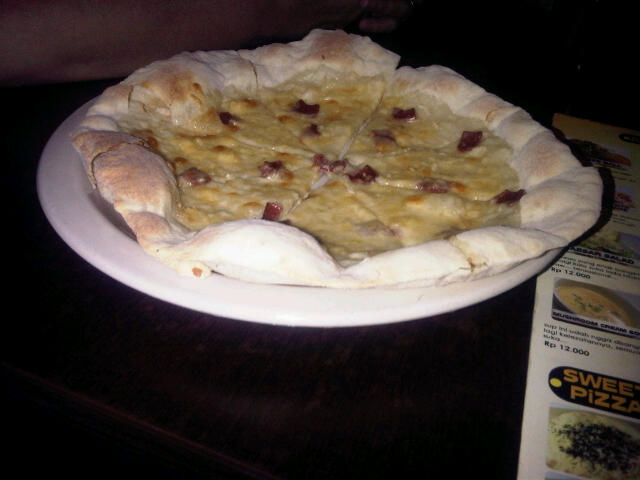 Saya dan bonyok masuk, lalu pesen pizza. Sudah diwanti-wanti di 4sq, bahwa nih tempat servisnya lelet, tapi saya nggak gentar. Beneran ternyata, pizzanya luama banget dihidanginnya, kira-kira sekitar 20 menit dari waktu mesan. Sampek di meja, kita bertiga pun ngincip-ngincip. Kesimpulannya: Beuh, cuman pizza beginian aja kok nih kedai bisa laris banget? Gondok, maka saya pun nyobain bikin pizza sendiri di rumah. Bahannya roti bulet, dan saya ambil bahan apa aja yang ada di kulkas. Saya panggang 15 menit, dan ketika panggangan ngeluarin bunyi..Ting! Saya pun antusias menghirup baunya. Haiyaa..sedap..