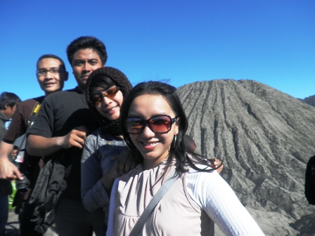 Dengan adanya rombongan yang semuanya sesama pecinta kamera (sebagian lagi seneng banget moto dan sebagian lagi seneng banget difoto!), maka klop deh itu pemandangan matahari terbit dilalap habis sama kita. Berkali-kali kita nyoba macem-macem pose dengan macem-macem latar belakang, mulai dari yang mataharinya masih malu-malu sampek malu-maluin alias silau banget, hihihi.. Sekalian juga saya sukses siaran langsung dari Bromo via HP. Begitu matahari mulai nongol dikit di ufuk timur, langsung saya narsis pakai kamera HP dan buruan saya upload fotonya ke Facebook, biar nggak hoax kalau ada isu bahwa saya lagi di Bromo dong aah..