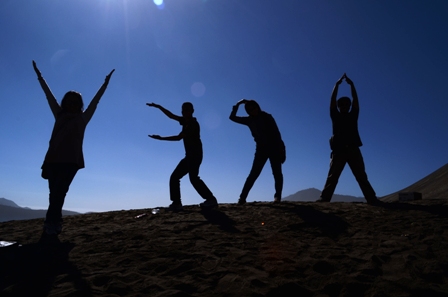 | Para blogger berbuat narsis dengan berpose membentuk inisial nama masing-masing. Lokasi: Kawah Bromo. Dari kiri ke kanan: V untuk Vicky Laurentina, F untuk Eddy Fahmi, R untuk Risdania Syafdini, A untuk Angki. |