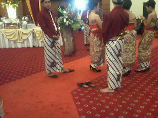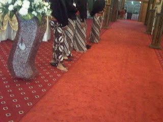 Menjelang resepsi, para pager bagus sudah berbaris rapi di pinggir karpet merah, menyambut penganten. Sepupu-sepupu saya berdiri gelisah, bolak-balik selopnya dicopot, sehingga beberapa kali kamera saya nangkep mereka nyeker. Saya ngerti sih, berdiri lama itu ngebosenin, tapi kelakuan bolak-balik nyopot selop itu kan ganjil?