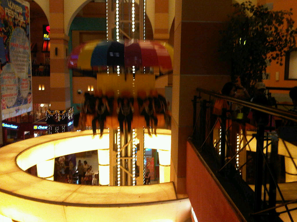 Suka lihat wahana ginian di tengah mal, tapi posisinya kadang membuat galau penumpangnya. Soalnya wahana ini punya posisi persis di depan kafe yang cukup ramai. Alhasil, siapapun yang naik wahana ini, sembari dibanting-banting dari atas ke bawah, dipaksa teriak-teriak ngeliat pengunjung lain yang lagi asyik-asyiknya mengudap nasi uduk.. Antara dibanting sambil ngiler liat orang lain makan. Sungguh bikin hati yang panik semakin galau.Lokasi: Mall of Indonesia, Jakarta.
