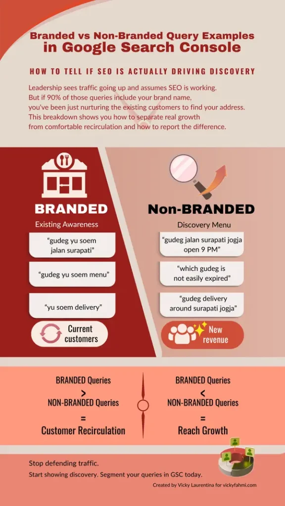 Branded queries are search terms that include your brand name, product or service names, or your brand combined with location or product descriptors. These searches indicate existing awareness, built by people who already know you exist and are specifically looking for you. Examples of branded queries: “Gudeg Yu Soem Jalan Surapati” (exact brand + location), or “Gudeg Yu Soem menu” (brand + product category).