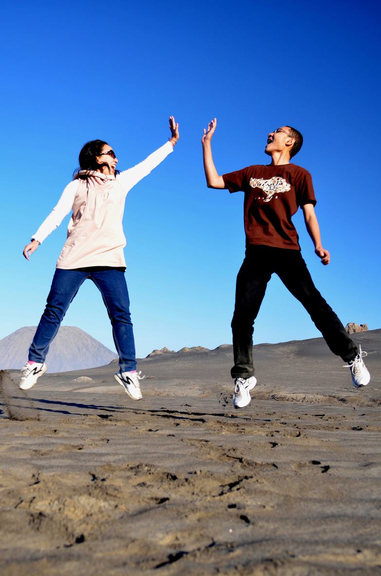 Foto ini diambil oleh Angki ketika kami hang out ke gurun pasir di Bromo weekend lalu. Sudah lama saya dan my hunk kepingin punya foto kami berdua lagi jumpalitan, tapi kendalanya ternyata banyak: