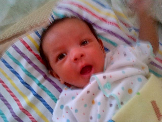 Saya dan my hunk berusaha bikin Fidel ketawa lagi di hari-hari kemudian. Kami menggendongnya dan bertanya, “Ayo ketawa lagi, Nak.. Mama Papa kepingin kamu ketawa.” Tapi dos-q nggak kunjung-kunjung ketawa juga. Jangankan ketawa, senyum pun enggak. Sekalinya dos-q nyengir, itu cuman sebentar, sehingga kami nggak sempat ambil HP buat merekam videonya. Video bayi nyengir. Padahal kita ngeharepin video bayi ketawa.