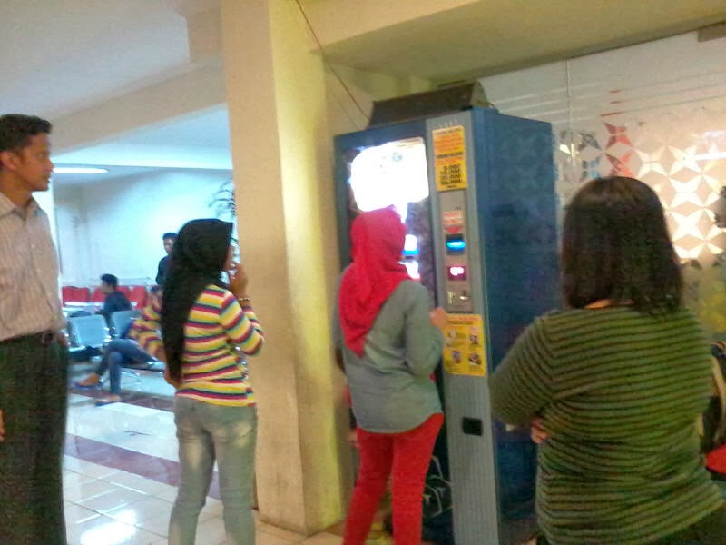 Terakhir kali saya lihat mesin ini waktu saya jalan-jalan ke Sinx. Perbedaan mesinnya, kalau di Sinx, mesinnya bersedia kasih minum meskipun kita cuman kasih koin. Tapi mesin yang di Indonesia, mesinnya cuman mau dikasih duit kertas, baru dia mau kasih kita minum. Kalau kasih koin doang, mesinnya ngelepeh koinnya. Yah kayaknya sebelas dua belas dengan pengemis di Cianjur yang ngelepeh kalo cuman dikasih koin. Padahal koinnya seribu. Dan koin seribu itu jarang banget. Pengemis siyalan. Nggak ngerti barang langka.