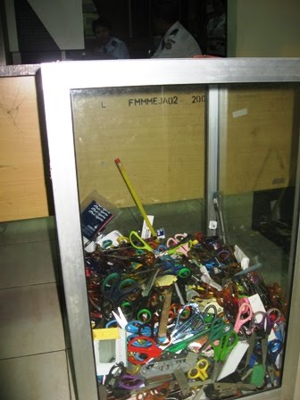 Banyak orang nggak tahu bahwa penerbangan mereka bisa bermasalah cuman gara-gara barang bawaan mereka sendiri. Salah satu item yang sering kena razia petugas bandara adalah cutter. Cutter sih masih mending, cuman sedikit satu-dua orang bego yang tahu bahwa cutter itu pisau. Tapi yang paling bikin orang jengah waktu dirazia adalah gunting. Ada alas an lucu kenapa orang mau bawa gunting ke mana-mana, termasuk pas naik pesawat. Misalnya buat buka bungkusan plastic makanan, kalau mau bekal jajanan buat dimakan dalam pesawat. Biasanya yang kayak gini itu kerjaan emak-emak. Nggak heran golongan yang paling sering kena razia adalah ibu-ibu. Saking seringnya, bandara terpaksa buka boks khusus gunting buat nampung gunting-gunting yang disita dari penumpang. Pertanyaan kecil saya, lha kalau gunting ini sudah numpuk banyak gini mau dibawa ke mana? Apa mau dibagiin satu-satu ke para petugas bandara? Kok nggak sekalian diloakin aja? Lumayan hasil loakannya bisa buat makan krupuk bersama-sama..
