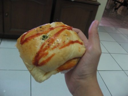 Kita perlu mengubah cara pikir kita yang kecanduan nasi, terutama untuk melatih mental kita supaya lebih fleksibel dan tidak tergantung pada nasi. Contoh kecil ya dalam kasus teman saya di atas, misalnya kalau kita harus melakukan perjalanan panjang, kita nggak perlu ribet nyiapin bekal nasi dari rumah, atau panic di tengah jalan nyari tempat persinggahan restoran yang jualan nasi. Lebih praktis kalau kita bawa roti buat makan, yang bisa dimakan dalam kendaraan tanpa harus cuci tangan. Bisa pilih sandwich isi daging asap, atau isi kulit ayam, lebih seru lagi diselipin daun selada yang dicocolin mayonaise. Kalau dirasa ribet nyiapinnya, bisa beli di toko-toko roti. Kayak roti yang saya foto ini, isinya roast beef dilumurin saos tomat, beli di toko kue paling tua di Braga, bandung. Minggu ini, toko kue yang paling beken di Bandung pada tahun 1930-an dan suka jadi langganan nonik-nonik Belanda ini, jual roti-rotinya sampek turun setengah harga. Cuman sampek 1 Agustus ini. Lumayan, roti ginian 10.000-an dapet tiga, hehehe.. Eh, ini sebenarnya mau cerita pengalaman temen, cerita Indonesia rawan pangan, atau mau ngiklan toko kue??