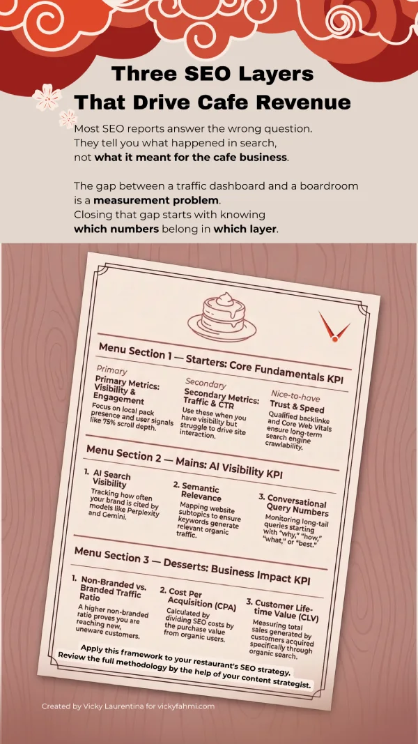 SEO performance of a cafe should be measured not just by engagement, but by starting with its visibility layer and then progressing through layers of engagement and revenue outcomes. Today, there are three types of key performance indicators (KPIs) we can set for a cafe website: core fundamentals, AI visibility, and business impact. Tracking these three KPIs tends to position them more effectively in answering the boss’s questions.